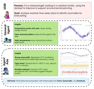 We introduce AgentAda, the first LLM-powered analytics agent that can learn and use new analytics skills to extract more specialized insights. Unlike existing methods that require users to manually decide which data analytics method to apply, AgentAda automatically identifies the skill needed from a library of analytical skills to perform the analysis. This also allows AgentAda to use skills that existing LLMs cannot perform out of the box. The library covers a range of methods, including clustering, predictive modeling, and NLP techniques like BERT, which allow AgentAda to handle complex analytics tasks based on what the user needs. AgentAda’s dataset-to-insight extraction strategy consists of three key steps: a (I) question generator to generate queries relevant to user’s goal and persona, a (II) hybrid Retrieval-Augmented Generation (RAG)-based skill matcher to choose the best data analytics skill from the skill library, and a (III) code generator that produces executable code based on the retrieved skill’s documentation to extract key patterns. We also introduce KaggleBench, a benchmark of curated notebooks across diverse domains, to evaluate AgentAda’s performance. We conducted a human evaluation demonstrating that AgentAda provides more insightful analytics than existing tools, with 48.78% of evaluators preferring its analyses, compared to 27.67% for the unskilled agent. We also propose a novel LLM-as-a-judge approach that we show is aligned with human evaluation as a way to automate insights’ quality evaluation at larger scale.