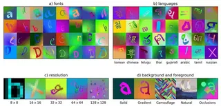 Progress in the field of machine learning has been fueled by the introduction of benchmark datasets pushing the limits of existing algorithms. Enabling the design of datasets to test specific properties and failure modes of learning algorithms is thus a problem of high interest, as it has a direct impact on innovation in the field. In this sense, we introduce Synbols – Synthetic Symbols – a tool for rapidly generating new datasets with a rich composition of latent features rendered in low resolution images. Synbols leverages the large amount of symbols available in the Unicode standard and the wide range of artistic font provided by the open font community. Our tool’s high-level interface provides a language for rapidly generating new distributions on the latent features, including various types of textures and occlusions. To showcase the versatility of Synbols, we use it to dissect the limitations and flaws in standard learning algorithms in various learning setups including supervised learning, active learning, out of distribution generalization, unsupervised representation learning, and object counting.