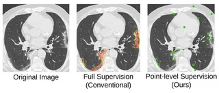 Coronavirus Disease 2019 (COVID-19) has spread aggressively across the world causing an existential health crisis. Thus, having a system that automatically detects COVID-19 in tomography (CT) images can assist in quantifying the severity of the illness. Unfortunately, labelling chest CT scans requires significant domain expertise, time, and effort. We address these labelling challenges by only requiring point annotations, a single pixel for each infected region on a CT image. This labeling scheme allows annotators to label a pixel in a likely infected region, only taking 1-3 seconds, as opposed to 10-15 seconds to segment a region. Conventionally, segmentation models train on point-level annotations using the cross-entropy loss function on these labels. However, these models often suffer from low precision. Thus, we propose a consistency-based (CB) loss function that encourages the output predictions to be consistent with spatial transformations of the input images. The experiments on 3 open-source COVID-19 datasets show that this loss function yields significant improvement over conventional point-level loss functions and almost matches the performance of models trained with full supervision with much less human effort.