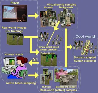 Image based human detection is of great interest due to its potential applications. However, even detecting non-occluded standing humans remains challenging. The most relevant baseline human detector relies on a holistic human classifier that uses histograms of oriented gradients (HOG) as features, and linear support vector machines (Lin-SVM) as learning method. In order to automatize and control the labelling process, we proposed the use of a realistic videogame, i.e., to capture labelled samples of pedestrians and background by playing. The challenge then is to see if the appearance of the virtual pedestrians and background is sufficiently realistic to lead to a pedestrian model that can be successfully applied in real images. We cast the problem as one of supervised domain adaptation, assuming that a small amount of manually labelled samples from real-world images is required. To collect these labelled samples we use an active learning technique. Thus, ultimately the human model is learnt by the combination of virtual- and real-world labelled samples. This combined space is termed cool world.